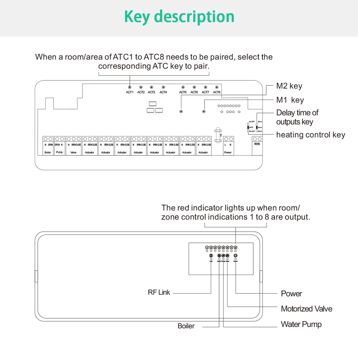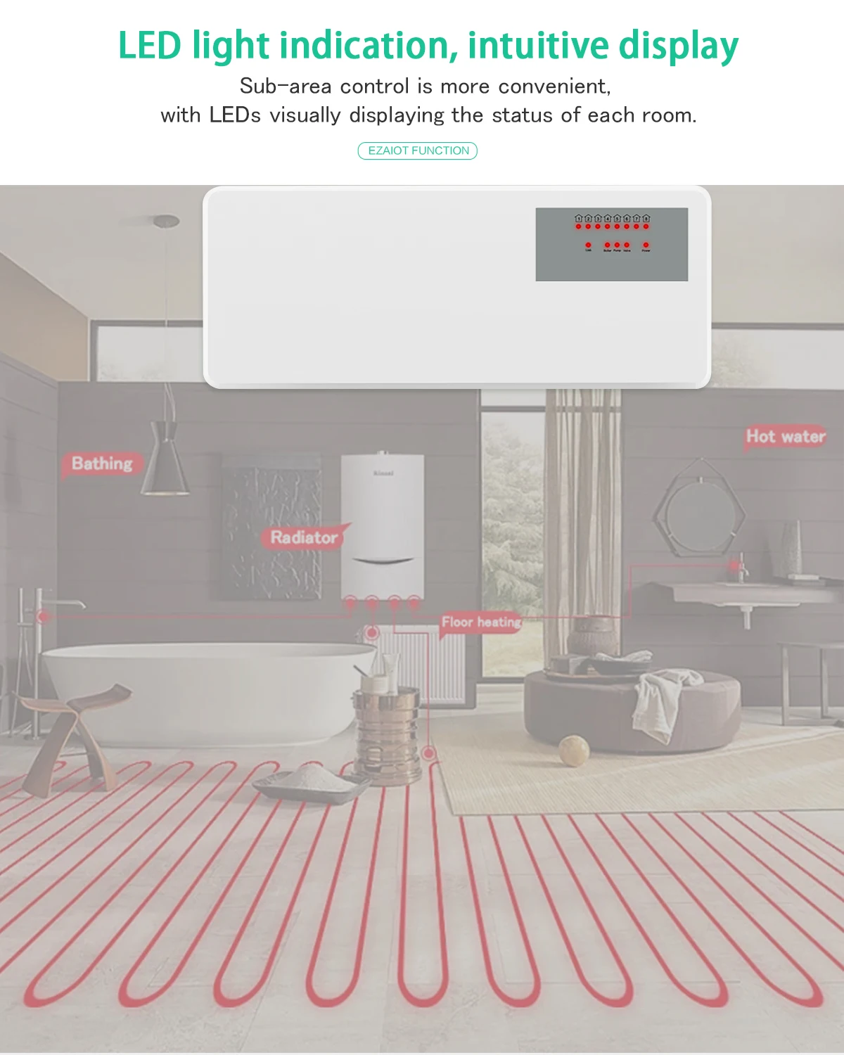 WBG833 wireless hub controller is suitable for controlling gas boilers, circulating pumps or electric actuators, i.e. multiple rooms independently using thermostats to control indoor temperature, with each thermostat controlling the respective branch electric heat actuators on the manifold separately to achieve independent temperature control for comfortable temperature control and reduced energy consumption.