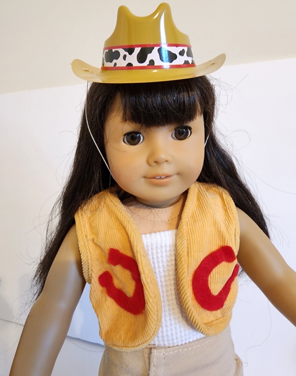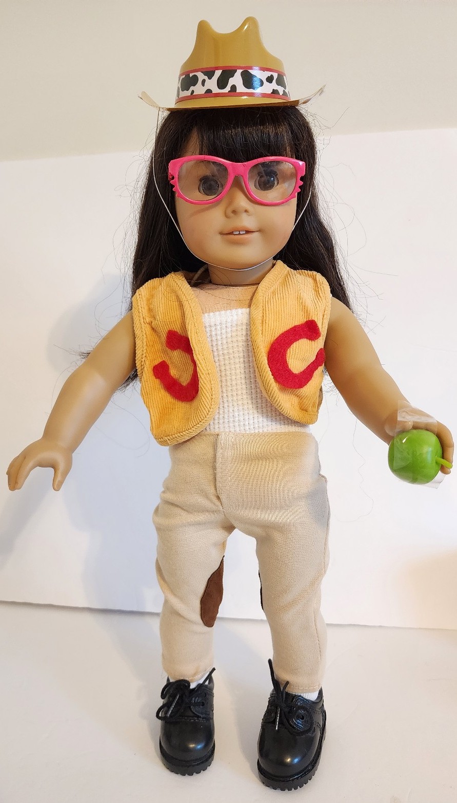 I am selling my beautiful American Girl Truly Me Doll with Dark Brown Hair and Brown Eyes. I bought her from a doll collector, she is clean & very cute. I did notice 1 small ink mark on her posterior right leg. She also seems to have some pink makeup on her cheeks? I wasn't sure how to remove the makeup? Her neck strings & side tag (2008) are intact. She is wearing her tan riding pants, mustard corduroy vest with red horse-shoes, and her white knit top. She is also wearing her black riding boots, white socks, and her tan cowgirl hat. She is holding a green apple for her pony.She has.her best friend " Lucky " the pony with her. Lucky is an animated pony that is battery-operated(3 AA needed). If the switch is on demo- moving the head area produces sound & and movement. Lucky is wearing her riding saddle, pink bridle, and long gold mustard colored tie. Lucky is also is wearing a straw hat for sun protection. Thanks.