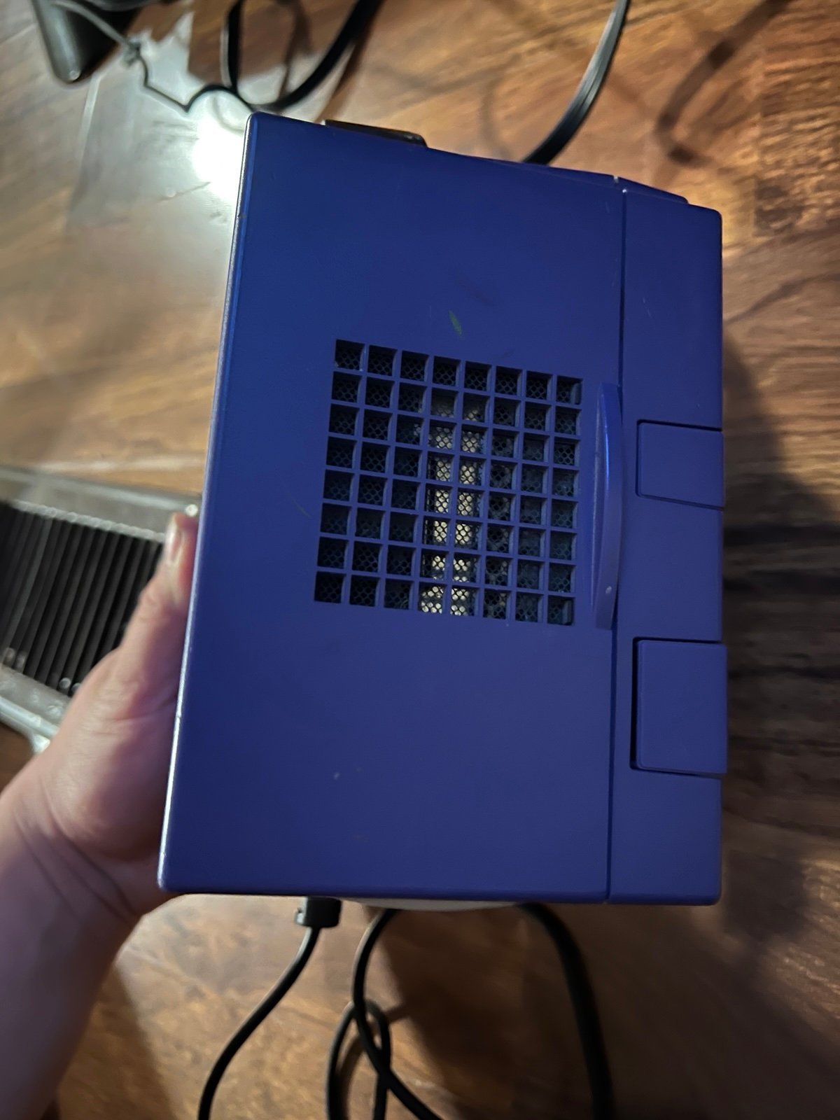 Purple game cube works and has scratches on top. Comes with a good shape black controller, comes with a purple one as well but the joysticks are damaged. Comes with 4 games they worked when I tried them. TMNT, Star Wars rogue leader, Mario kart double dash and Metroid prime. The open button gets jammed so I’m sure someone could fix it but it still can close and stay closed if you don’t do it hard.
