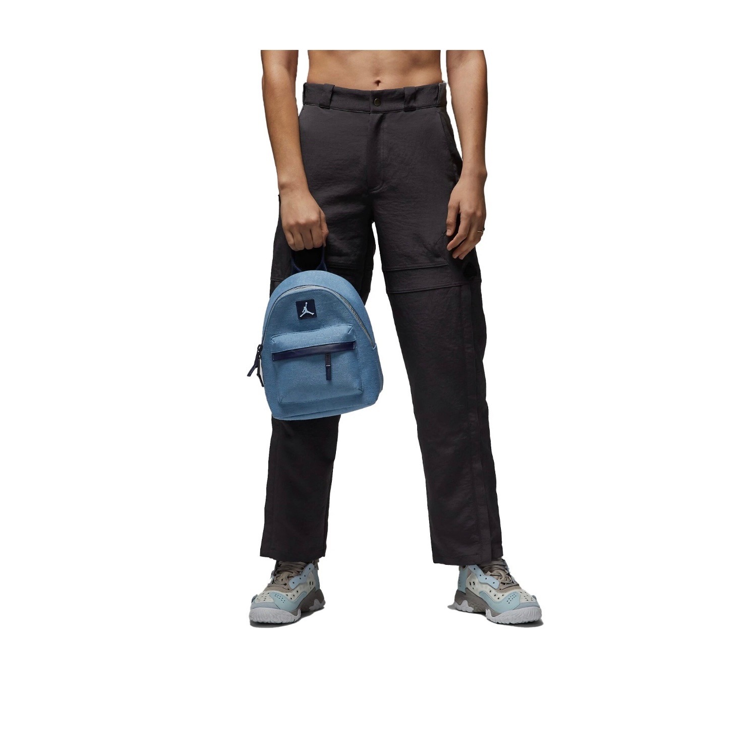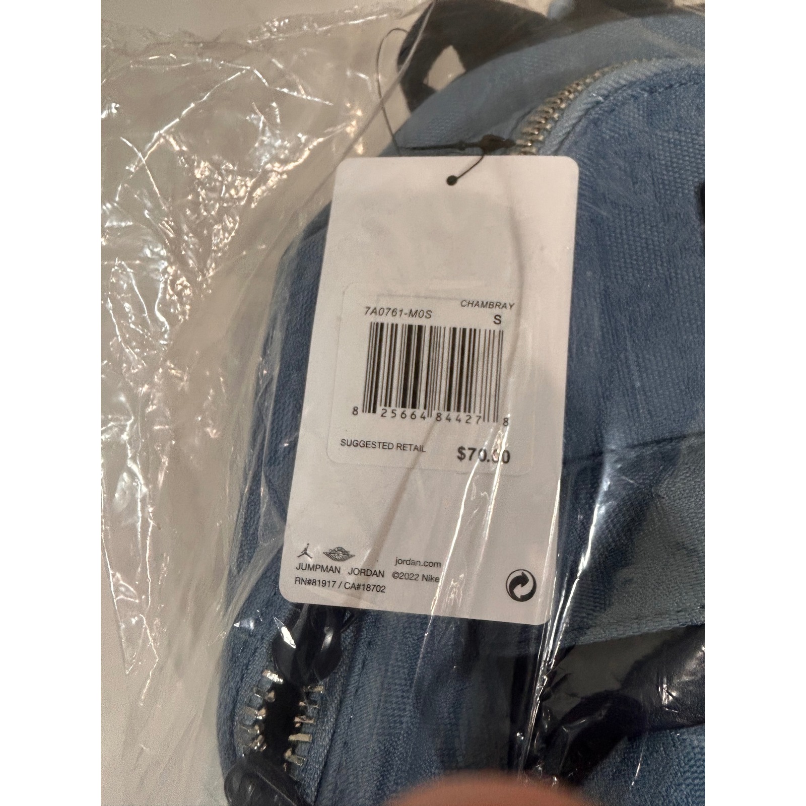 Brand new Jordan mini backpack, showcasing a captivating chambray blue color. This stylish bag features a Jumpman logo. Its functional design includes a main compartment and a front pocket, both secured with zipper closures. The backpack is completed with adjustable shoulder straps, allowing for a comfortable and customizable fit.
