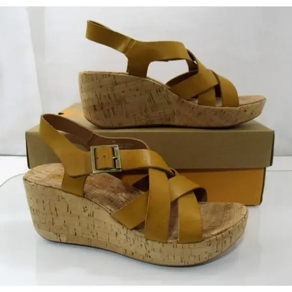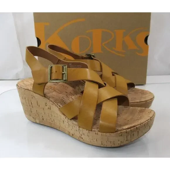 Style Name NovaKR0013107 Shoe style Comfort Platform Wedge Cork wedge Material Hand finished soft burnished faux leather upper Heel Height Approx. 3 inch heel , 1.75 inch platform Size US 8 / EUR 39 Details If Korks could pick just one sandal to wear the entire summer, it would be the Nova. This flattering slingback wedge is the ultimate go-anywhere style.- Buckle closure- Padded insole- Comfort technology- Breathable soft polyurethane lining- Cushioned breathable cork covered footbed with added foam for extra comfort- Cork wrapped wedge and platform Out-Sole High-traction lightweight rubber outsole
