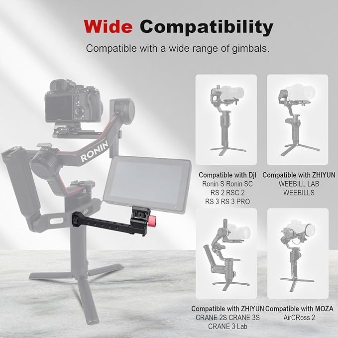 Multi-Brand Stabilizer Compatibility: CNC-machined aluminum extension arm secures monitors/LED panels on Ronin S, RS2, RSC2, Zhiyun Weebill-S, MOZA AirCross 2, and Crane 3S via 1/4"-20 threads and M4 screw holes