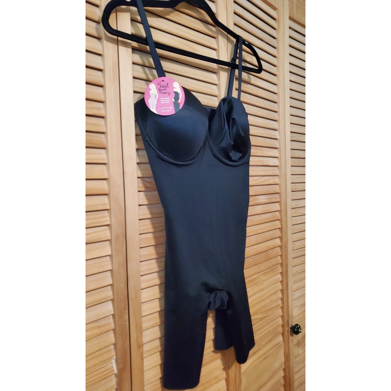 The NWT SPANX Women's Large Suit Your Fancy Strapless Cupped Mid-Thigh Bodysuit is a solid black shapewear piece designed for firm compression in key areas like the buttocks, chest, body, abdomen, and legs. Made of 51% elastane and 49% nylon microfiber fabric, this bodysuit features underwiring and adjustable straps for a customized fit. With a convertible design and demi cup support, this one-piece bodysuit provides both style and functionality for a flattering silhouette. Made in the United States by the trusted brand Spanx, this bodysuit is a versatile and high-quality addition to any wardrobe.