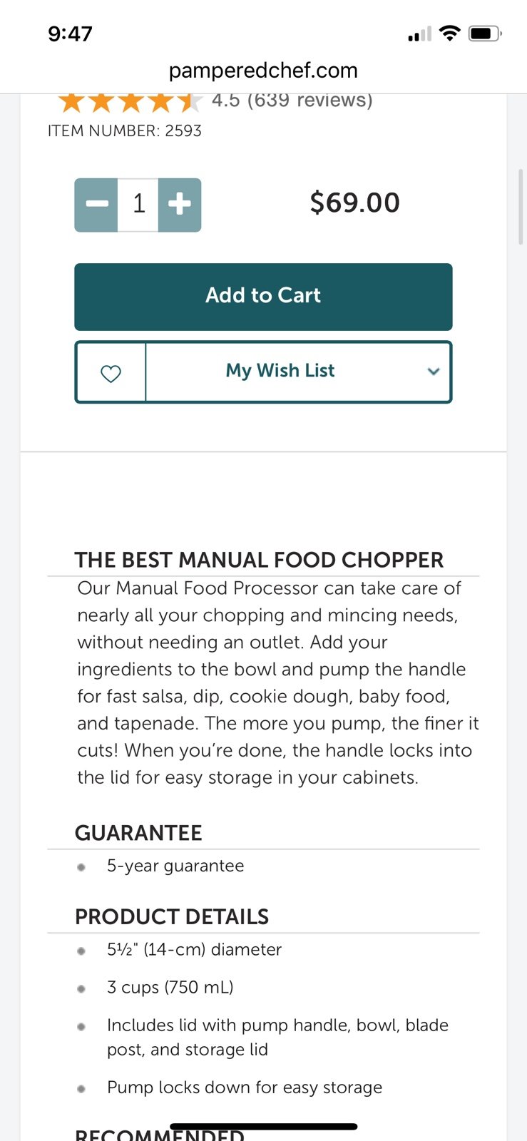 Brand new pampered chef manual food processor. I have attached pictures from the website so that I won't have to take it out of the packaging! Would make a great gift!