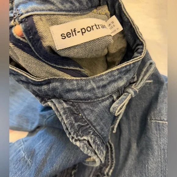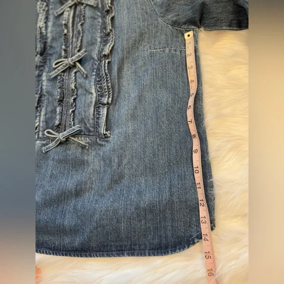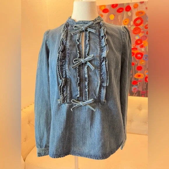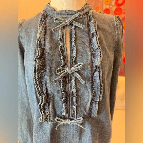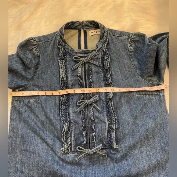 Self-Portrait Bow-Detailed Long Sleeved Denim BlouseSize 6 USUsed - good condition, no holes no stains nothing wrong with it . From dog friendly non smoking homeDecorative front bowsButtoned cuffsRuffle at front100% CottonCare: Wash at 30øCColors: DenimFastening: HooksNeckline: Round-neckedSleeves: Long SleevesMade: China