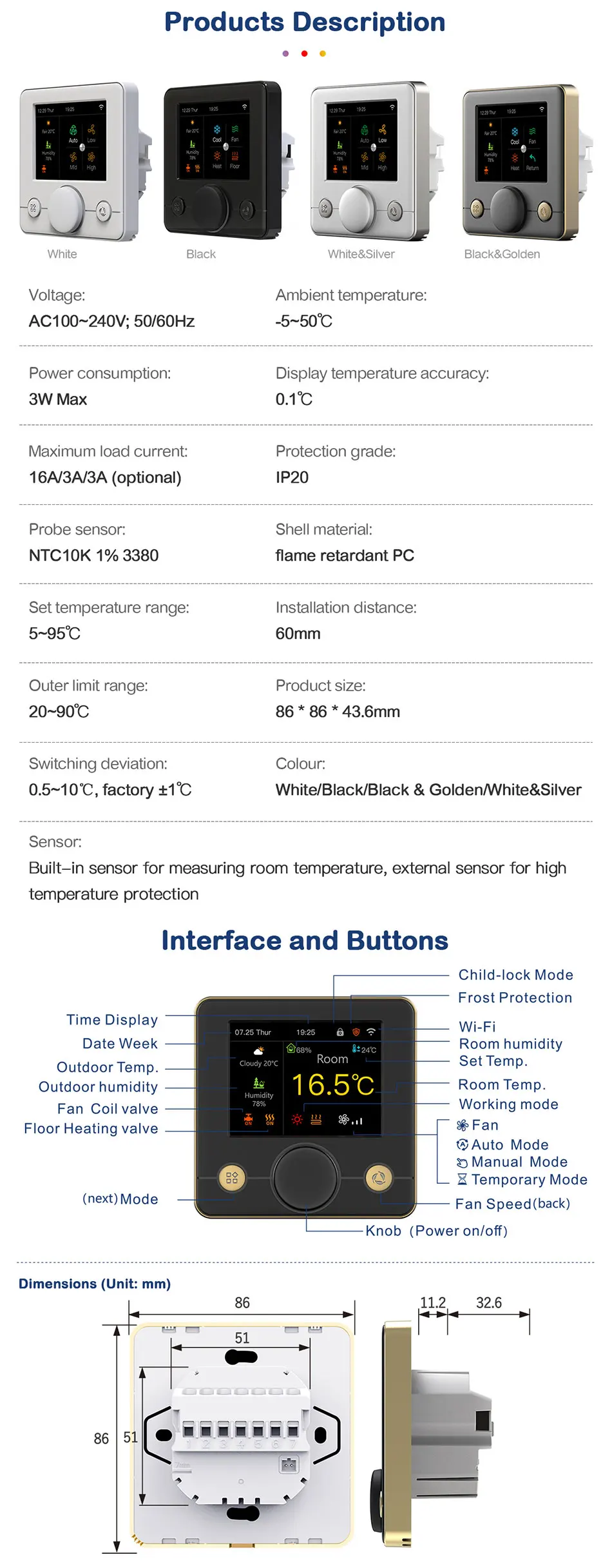 Sensor: Built-in sensor for measuring room temperature, external sensor for high temperature protection