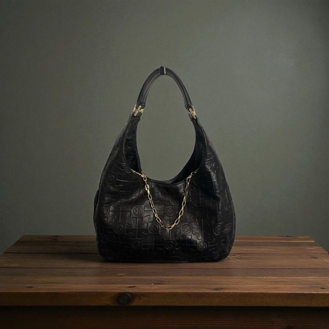Tory Burch brings us this classy bag that has been crafted from logo-embossed leather. It has a classy black hue and a spacious canvas interior capable of carrying your essentials. The piece comes equipped with two top handles and gold hardware.